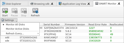 The S.M.A.R.T monitor can either be refreshed manually or run continuously to keep the information current. To run the S.M.A.R.T monitor, click the Start button on the action toolbar. To pause or stop auto-refreshing sequence click Pause or Stop buttons in view's toolbar accordingly.