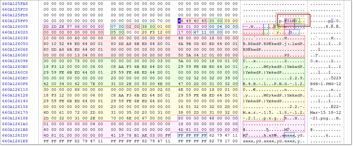 Use data templates to inspect file record. Depending on file system, they can be named as file record templates, directory entries or superblocks.