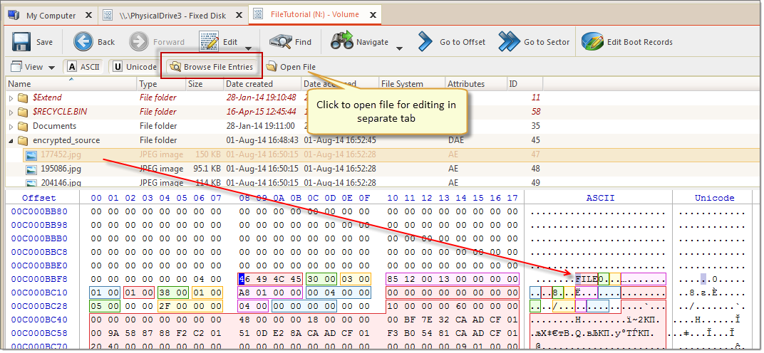 When editing volume (logical drive) you also can navigate file records. To activate this feature toggle on Browse File Entries button in toolbar. By selecting file or folder in file's tree editor's pane will automatically repositions to beginning of file entry record. If recognized, file can be previewed in File Preview pane and Property pane will display file's most common attributes and properties.