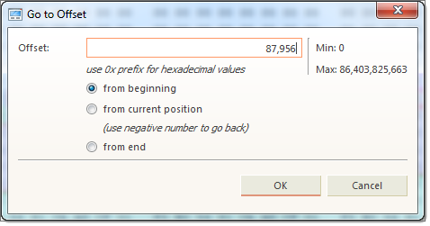 You can use both decimal and hexadecimal values, preceding hexadecimal values with 0x. For example, to specify location 512 as a hexadecimal number, enter 0x200. There are also options to specify an offset from the beginning, from the current position, or from the end.